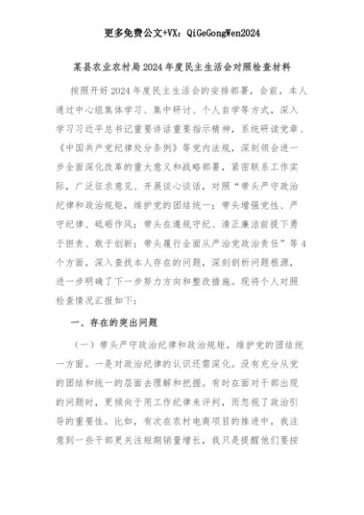 【七哥公文】2025年:某县农业农村局2024年度民主生活会对照检查材料+更多免费公文+VX:QiGeGongWen2024+更多免费公文+VX:QiGeGongWen2024