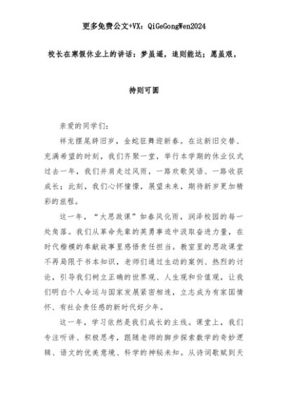 【七哥公文】2025年:校长在寒假休业上的讲话:梦虽遥,追则能达;愿虽艰,持则可圆+更多免费公文+VX:QiGeGongWen2024+更多免费公文+VX:QiGeGongWen2024