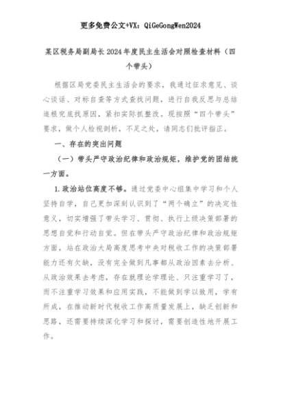 【七哥公文】2025年:某区税务局副局长2024年度民主生活会对照检查材料(四个带头)+更多免费公文+VX:QiGeGongWen2024+更多免费公文+VX:QiGeGongWen2024