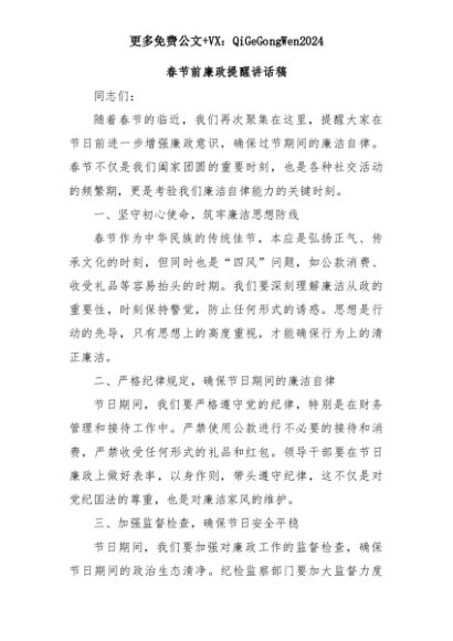 【七哥公文】2025年:春节前廉政提醒讲话稿+更多免费公文+VX:QiGeGongWen2024+更多免费公文+VX:QiGeGongWen2024