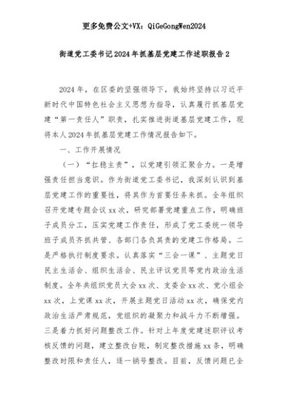 【七哥公文】2025年:街道党工委书记2024年抓基层党建工作述职报告2+更多免费公文+VX:QiGeGongWen2024+更多免费公文+VX:QiGeGongWen2024