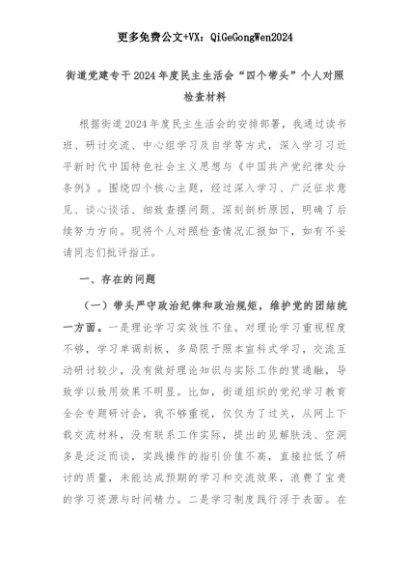 【七哥公文】2025年:街道党建专干2024年度民主生活会“四个带头”个人对照检查材料+更多免费公文+VX:QiGeGongWen2024+更多免费公文+VX:QiGeGongWen2024