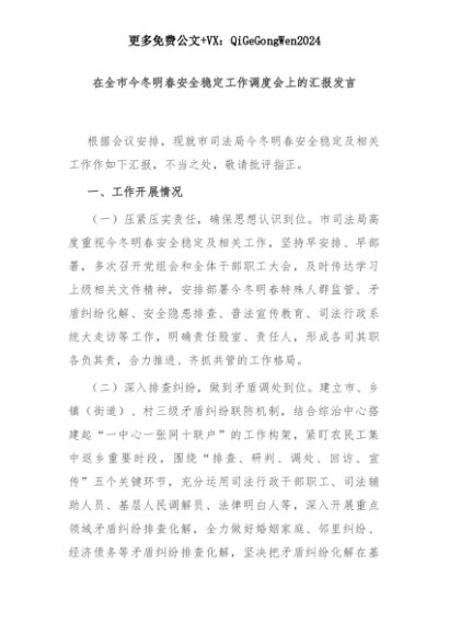 【七哥公文】2025年:在全市今冬明春安全稳定工作调度会上的汇报发言+更多免费公文+VX:QiGeGongWen2024+更多免费公文+VX:QiGeGongWen2024