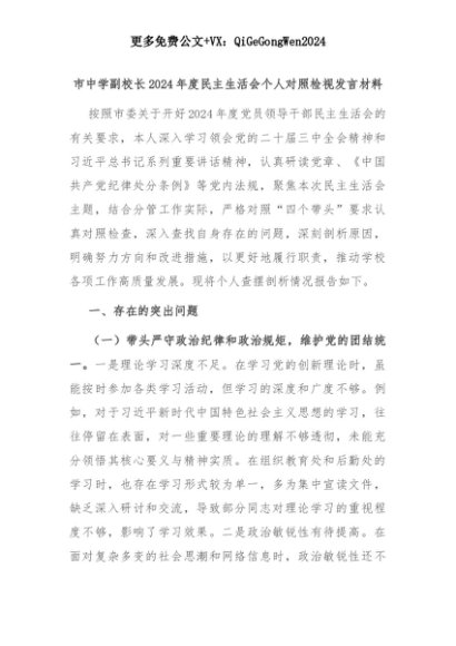 【七哥公文】2025年:市中学副校长2024年度民主生活会个人对照检视发言材料+更多免费公文+VX:QiGeGongWen2024+更多免费公文+VX:QiGeGongWen2024