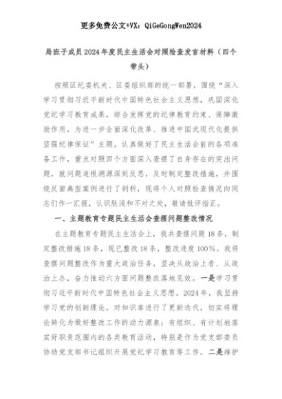 【七哥公文】2025年:局班子成员2024年度民主生活会对照检查发言材料(四个带头)+更多免费公文+VX:QiGeGongWen2024+更多免费公文+VX:QiGeGongWen2024