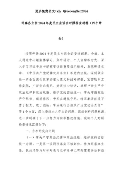 【七哥公文】2025年:巡察办主任2024年度民主生活会对照检查材料(四个带头)+更多免费公文+VX:QiGeGongWen2024+更多免费公文+VX:QiGeGongWen2024