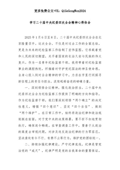 【七哥公文】2025年:学习二十届中央纪委四次全会精神心得体会+更多免费公文+VX:QiGeGongWen2024+更多免费公文+VX:QiGeGongWen2024