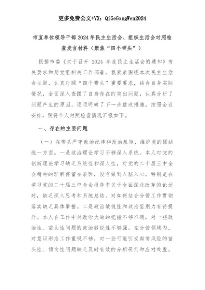 【七哥公文】2025年:市直单位领导干部2024年民主生活会、组织生活会对照检查发言材料(聚焦“四个带头”)+更多免费公文+VX:QiGeGongWen2024+更多免费公文+VX:QiGeGongWen2024
