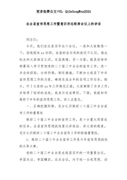 【七哥公文】2025年:在全县宣传思想工作暨意识形态联席会议上的讲话+更多免费公文+VX:QiGeGongWen2024+更多免费公文+VX:QiGeGongWen2024