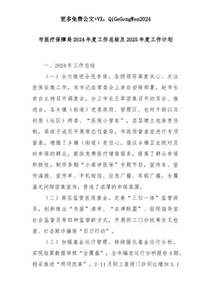 【七哥公文】2025年:市医疗保障局2024年度工作总结及2025年度工作计划+更多免费公文+VX:QiGeGongWen2024+更多免费公文+VX:QiGeGongWen2024