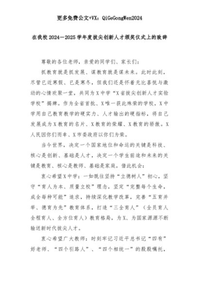 【七哥公文】2025年:在我校2024-2025学年度拔尖创新人才颁奖仪式上的致辞+更多免费公文+VX:QiGeGongWen2024+更多免费公文+VX:QiGeGongWen2024