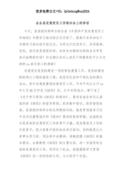 【七哥公文】2025年:在全县发展党员工作培训会上的讲话+更多免费公文+VX:QiGeGongWen2024+更多免费公文+VX:QiGeGongWen2024