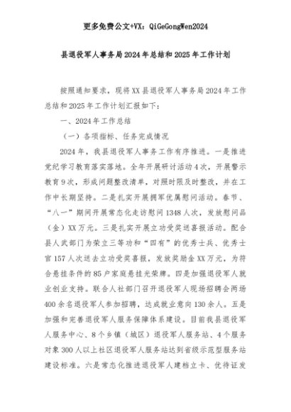 【七哥公文】2025年:县退役军人事务局2024年总结和2025年工作计划+更多免费公文+VX:QiGeGongWen2024+更多免费公文+VX:QiGeGongWen2024