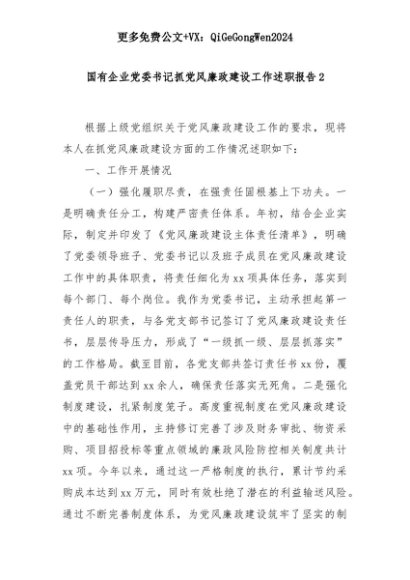 【七哥公文】2025年:国有企业党委书记抓党风廉政建设工作述职报告2+更多免费公文+VX:QiGeGongWen2024+更多免费公文+VX:QiGeGongWen2024