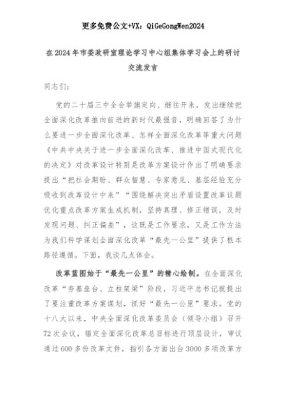 【七哥公文】2025年:在2024年市委政研室理论学习中心组集体学习会上的研讨交流发言+更多免费公文+VX:QiGeGongWen2024+更多免费公文+VX:QiGeGongWen2024