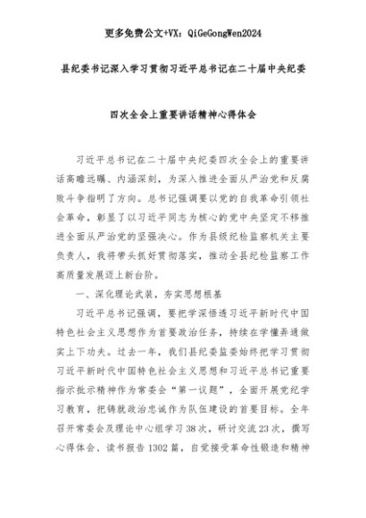 【七哥公文】2025年:县纪委书记深入学习贯彻习近平总书记在二十届中央纪委四次全会上重要讲话精神心得体会+更多免费公文+VX:QiGeGongWen2024+更多免费公文+VX:QiGeGongWen2024