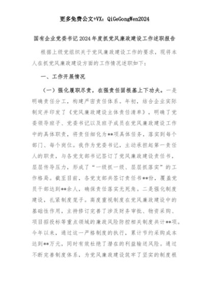 【七哥公文】2025年:国有企业党委书记2024年度抓党风廉政建设工作述职报告+更多免费公文+VX:QiGeGongWen2024+更多免费公文+VX:QiGeGongWen2024