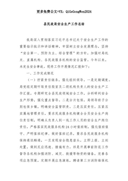 【七哥公文】2025年:县民政局安全生产工作总结+更多免费公文+VX:QiGeGongWen2024+更多免费公文+VX:QiGeGongWen2024