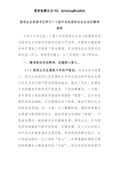 【七哥公文】2025年:国有企业党委书记学习二十届中央纪委四次全会会议精神感悟+更多免费公文+VX:QiGeGongWen2024+更多免费公文+VX:QiGeGongWen2024