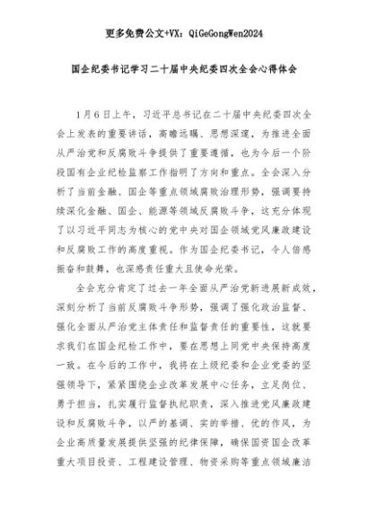 【七哥公文】2025年:国企纪委书记学习二十届中央纪委四次全会心得体会+更多免费公文+VX:QiGeGongWen2024+更多免费公文+VX:QiGeGongWen2024