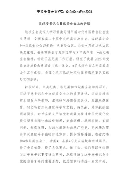 【七哥公文】2025年:县纪委书记在县纪委全会上的讲话+更多免费公文+VX:QiGeGongWen2024+更多免费公文+VX:QiGeGongWen2024