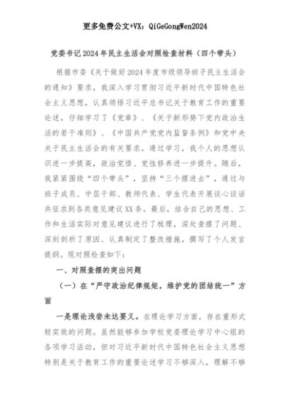 【七哥公文】2025年:党委书记2024年民主生活会对照检查材料(四个带头)+更多免费公文+VX:QiGeGongWen2024+更多免费公文+VX:QiGeGongWen2024