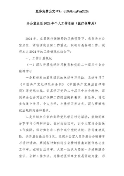 【七哥公文】2025年:办公室主任2024年个人工作总结(医疗保障局)+更多免费公文+VX:QiGeGongWen2024+更多免费公文+VX:QiGeGongWen2024