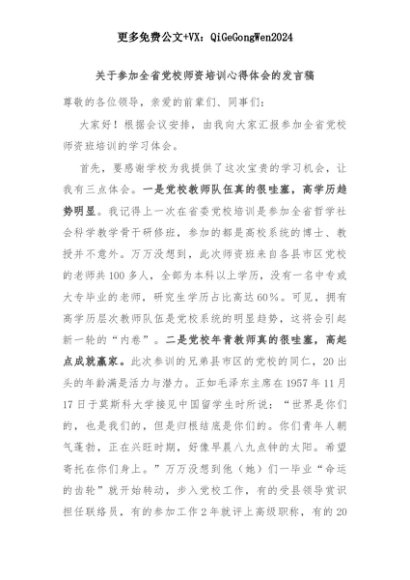 【七哥公文】2025年:关于参加全省党校师资培训心得体会的发言稿+更多免费公文+VX:QiGeGongWen2024+更多免费公文+VX:QiGeGongWen2024