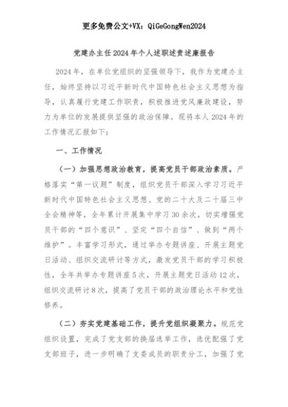 【七哥公文】2025年:党建办主任2024年个人述职述责述廉报告+更多免费公文+VX:QiGeGongWen2024+更多免费公文+VX:QiGeGongWen2024