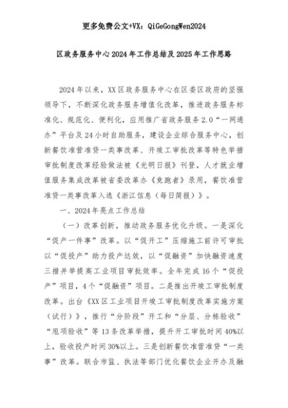 【七哥公文】2025年:区政务服务中心2024年工作总结及2025年工作思路+更多免费公文+VX:QiGeGongWen2024+更多免费公文+VX:QiGeGongWen2024
