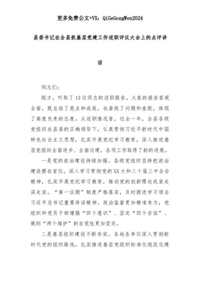 【七哥公文】2025年:县委书记在全县抓基层党建工作述职评议大会上的点评讲话+更多免费公文+VX:QiGeGongWen2024+更多免费公文+VX:QiGeGongWen2024