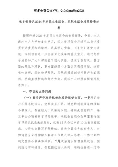 【七哥公文】2025年:党支部书记2024年度民主生活会、组织生活会对照检查材料+更多免费公文+VX:QiGeGongWen2024+更多免费公文+VX:QiGeGongWen2024