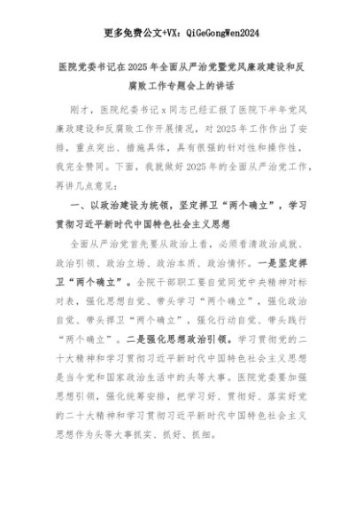 【七哥公文】2025年:医院党委书记在2025年全面从严治党暨党风廉政建设和反腐败工作专题会上的讲话+更多免费公文+VX:QiGeGongWen2024+更多免费公文+VX:QiGeGongWen2024