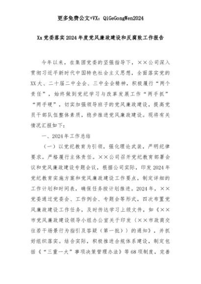 【七哥公文】2025年:Xx党委落实2024年度党风廉政建设和反腐败工作报告+更多免费公文+VX:QiGeGongWen2024+更多免费公文+VX:QiGeGongWen2024