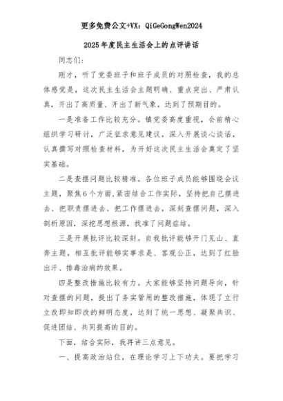 【七哥公文】2025年:2025年度民主生活会上的点评讲话+更多免费公文+VX:QiGeGongWen2024+更多免费公文+VX:QiGeGongWen2024