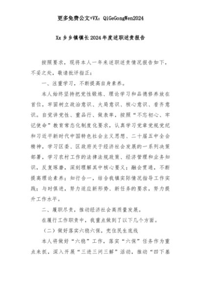 【七哥公文】2025年:Xx乡乡镇镇长2024年度述职述责报告+更多免费公文+VX:QiGeGongWen2024+更多免费公文+VX:QiGeGongWen2024