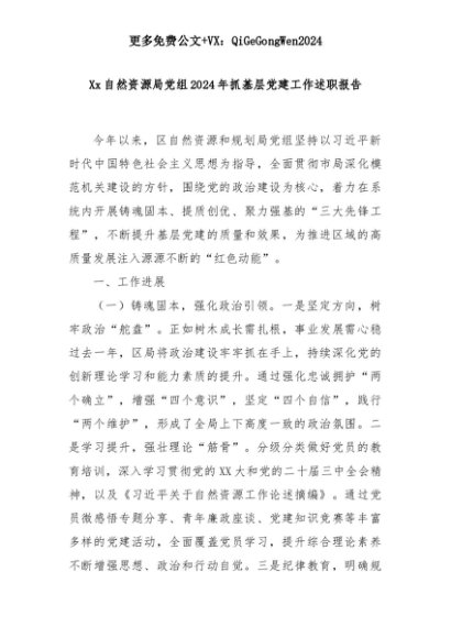 【七哥公文】2025年:Xx自然资源局党组2024年抓基层党建工作述职报告+更多免费公文+VX:QiGeGongWen2024+更多免费公文+VX:QiGeGongWen2024