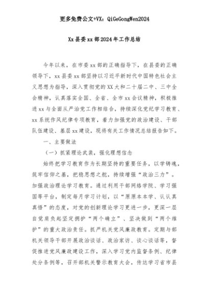 【七哥公文】2025年:Xx县委xx部2024年工作总结+更多免费公文+VX:QiGeGongWen2024+更多免费公文+VX:QiGeGongWen2024