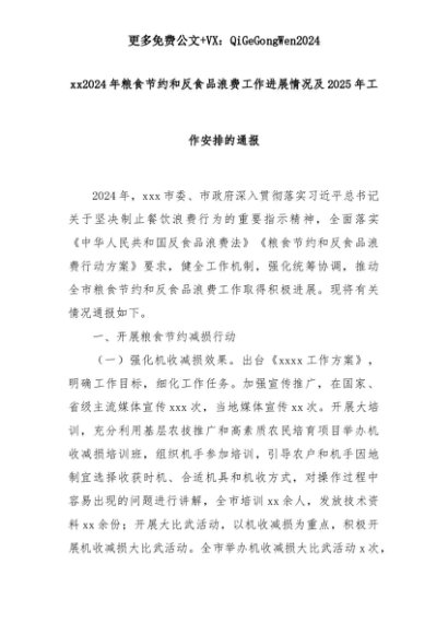 【七哥公文】2025年:xx2024年粮食节约和反食品浪费工作进展情况及2025年工作安排的通报+更多免费公文+VX:QiGeGongWen2024+更多免费公文+VX:QiGeGongWen2024