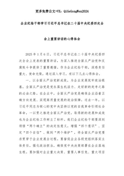 【七哥公文】2025年:企业纪检干部学习习近平总书记在二十届中央纪委四次全会上重要讲话的心得体会+更多免费公文+VX:QiGeGongWen2024+更多免费公文+VX:QiGeGongWen2024