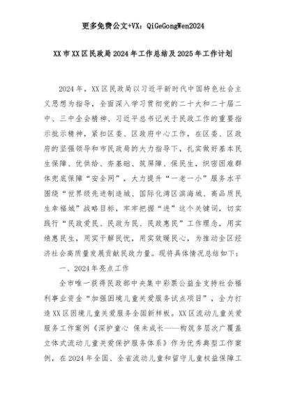 【七哥公文】2025年:XX市XX区民政局2024年工作总结及2025年工作计划+更多免费公文+VX:QiGeGongWen2024+更多免费公文+VX:QiGeGongWen2024