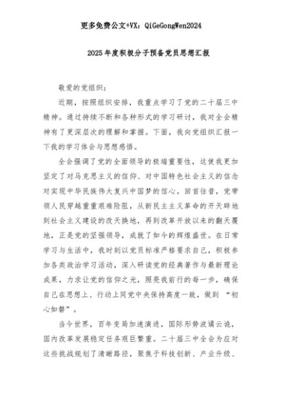【七哥公文】2025年:2025年度积极分子预备党员思想汇报+更多免费公文+VX:QiGeGongWen2024+更多免费公文+VX:QiGeGongWen2024