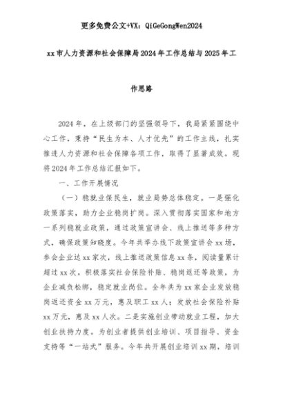 【七哥公文】2025年:xx市人力资源和社会保障局2024年工作总结与2025年工作思路+更多免费公文+VX:QiGeGongWen2024+更多免费公文+VX:QiGeGongWen2024