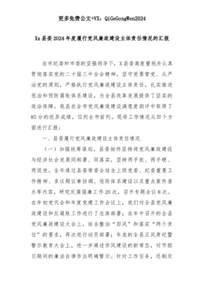 【七哥公文】2025年:Xx县委2024年度履行党风廉政建设主体责任情况的汇报+更多免费公文+VX:QiGeGongWen2024+更多免费公文+VX:QiGeGongWen2024