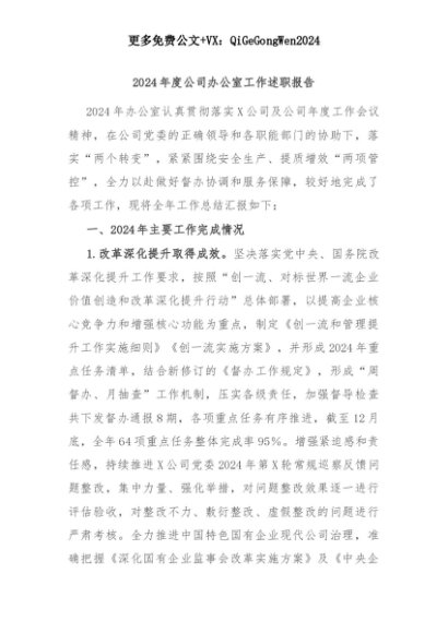 【七哥公文】2025年:2024年度公司办公室工作述职报告+更多免费公文+VX:QiGeGongWen2024+更多免费公文+VX:QiGeGongWen2024