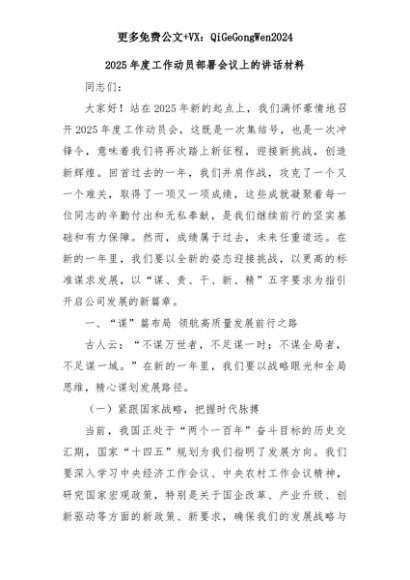 【七哥公文】2025年:2025年度工作动员部署会议上的讲话材料+更多免费公文+VX:QiGeGongWen2024+更多免费公文+VX:QiGeGongWen2024