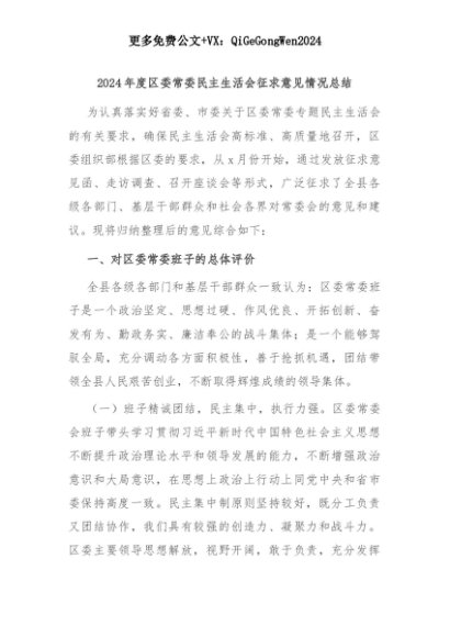【七哥公文】2025年:2024年度区委常委民主生活会征求意见情况总结+更多免费公文+VX:QiGeGongWen2024+更多免费公文+VX:QiGeGongWen2024