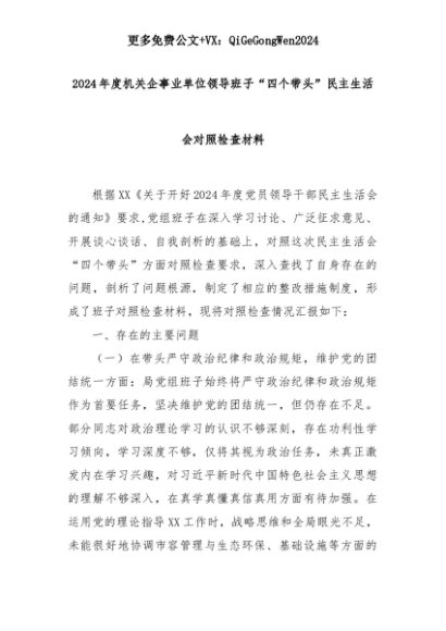 【七哥公文】2025年:2024年度机关企事业单位领导班子“四个带头”民主生活会对照检查材料+更多免费公文+VX:QiGeGongWen2024+更多免费公文+VX:QiGeGongWen2024