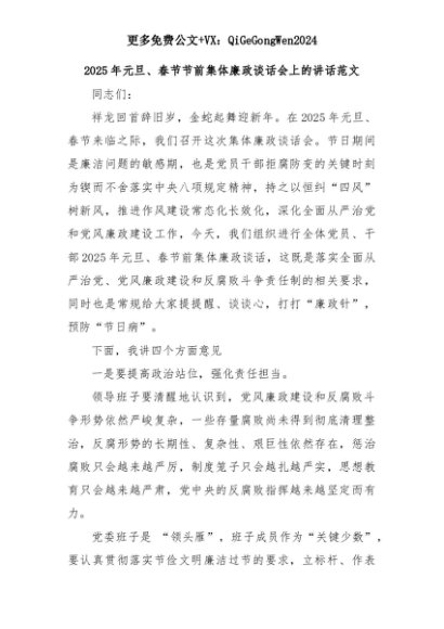【七哥公文】2025年:2025年元旦、春节节前集体廉政谈话会上的讲话范文+更多免费公文+VX:QiGeGongWen2024+更多免费公文+VX:QiGeGongWen2024