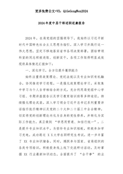【七哥公文】2025年:2024年度中层干部述职述廉报告+更多免费公文+VX:QiGeGongWen2024+更多免费公文+VX:QiGeGongWen2024